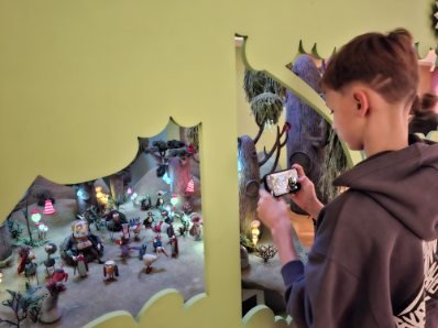 Učenci filmske vzgoje 1 so si v četrtek, 20. 11., v ljubljanski Kinoteki ogledali animirani film Zgodbe iz čarobnega vrta. Sledil je ogled razstave, ki z originalnimi scenami in lutkami prikazuje nastanek filma. Na koncu so se učenci še sami preizkusili kot sinhronizatorji in animatorji.