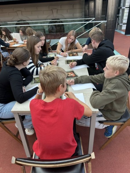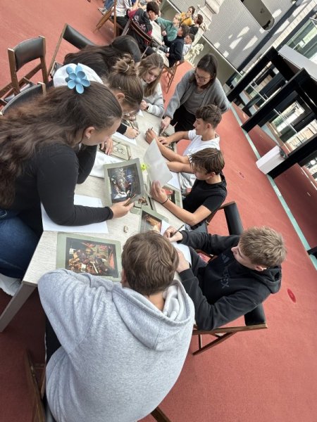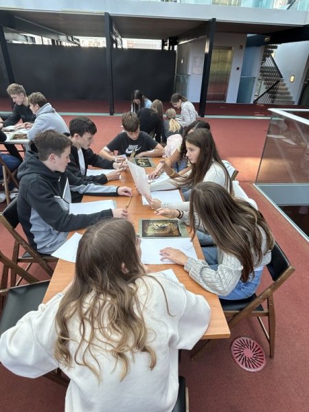 Po ogledani predstavi smo se odpravili v Narodno galerijo. Razdelili smo se v dve skupini, da je bil ogled lažji in bolj učinkovit. Vodički sta nas ob branju pesmi Andreja Rozmana Roze popeljali skozi obdobja umetnosti in slikarstva. Spoznali smo znane slovenske slike, kot so: Sejalec Ivana Groharja, Kofetarica Ivane Kobilca (na njej je uprizorjena stara gospa, ki srka kavo) in oltarno sliko sv. Jurija, ki je ubil zmaja. Na koncu smo se še sami preizkusili v pisanju pesmi: poustvarjali smo tako, da smo si ogledali sliko in morali zložiti pesem ob njej, kot je pred nami že storil Andrej Rozman Roza, ki v zbirki Pesmi iz galerije hudomušno opisuje znane slike v njej.