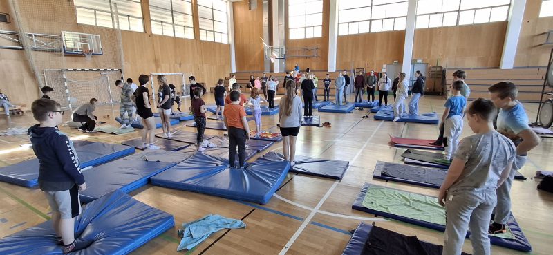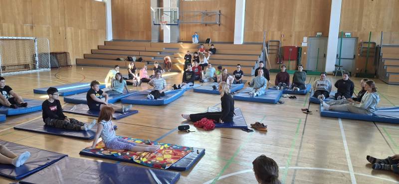 Četrto šolsko uro je učitreljica Irena vodila uro joge, kjer so učenci z različnimi vajami raztezali mišice, se urili v pravilni drži hrbtenice in predvsem po svojih zmožnostih sodelovali pri vajah.